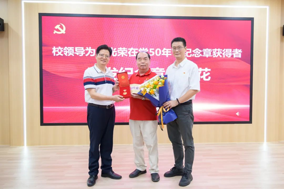 为庆祝中国共产党成立104周年,传承红色基因,凝聚奋进力量,7月1日,广州新华学院在三全育人促进中心·思政育人空间举行“光荣在党50年”纪念章颁发仪式暨“七一”党员慰问座谈会。学校党委书记郝登峰,纪委书记林源,监事会监事长、“光荣在党50年”纪念章获得者蓝永金,以及青年党员代表、新接收预备党员代表与受慰问党员代表共同出席了本次活动。